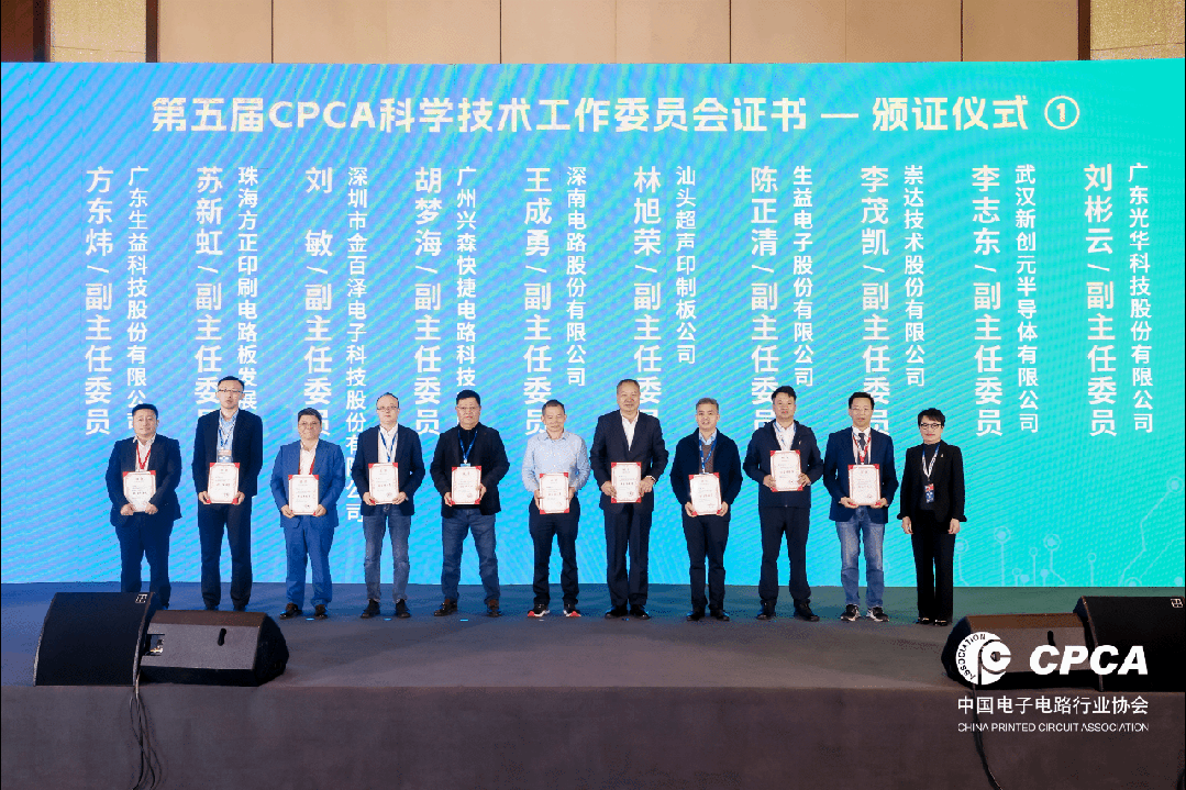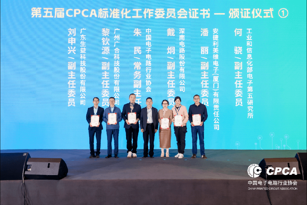 CPCA标准化工作委员会主任委员陈长生,顾问薛超、王建国、柴志强,副主任委员戴炯、黎钦源、潘丽、刘申兴、何骁依次为第五届CPCA标委会委员颁发证书。